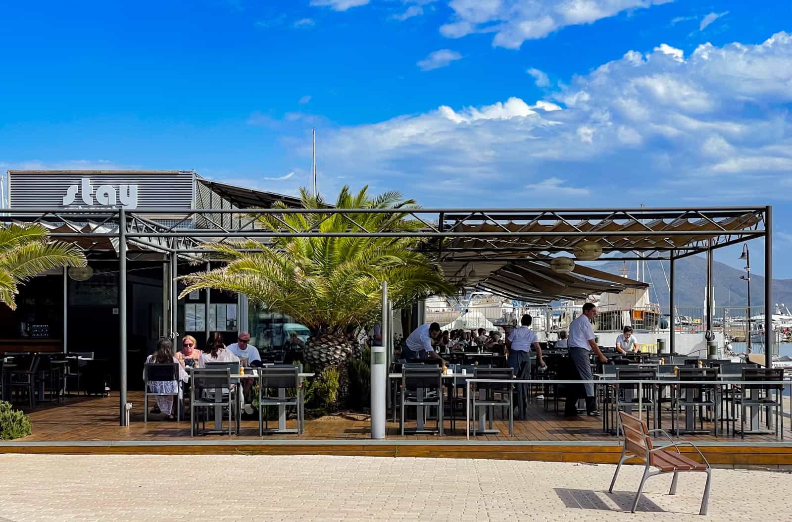 Y el "Stay" está situado en el puerto, sobre un largo muelle, con forma un poco de hacha. El mango va paralelo al muelle, la parte afilada está delante del restaurante. Allí suele haber sitio sin reserva, porque los turistas prefieren sentarse directamente junto al mar. A cambio, delante estáis bien protegidos del viento.